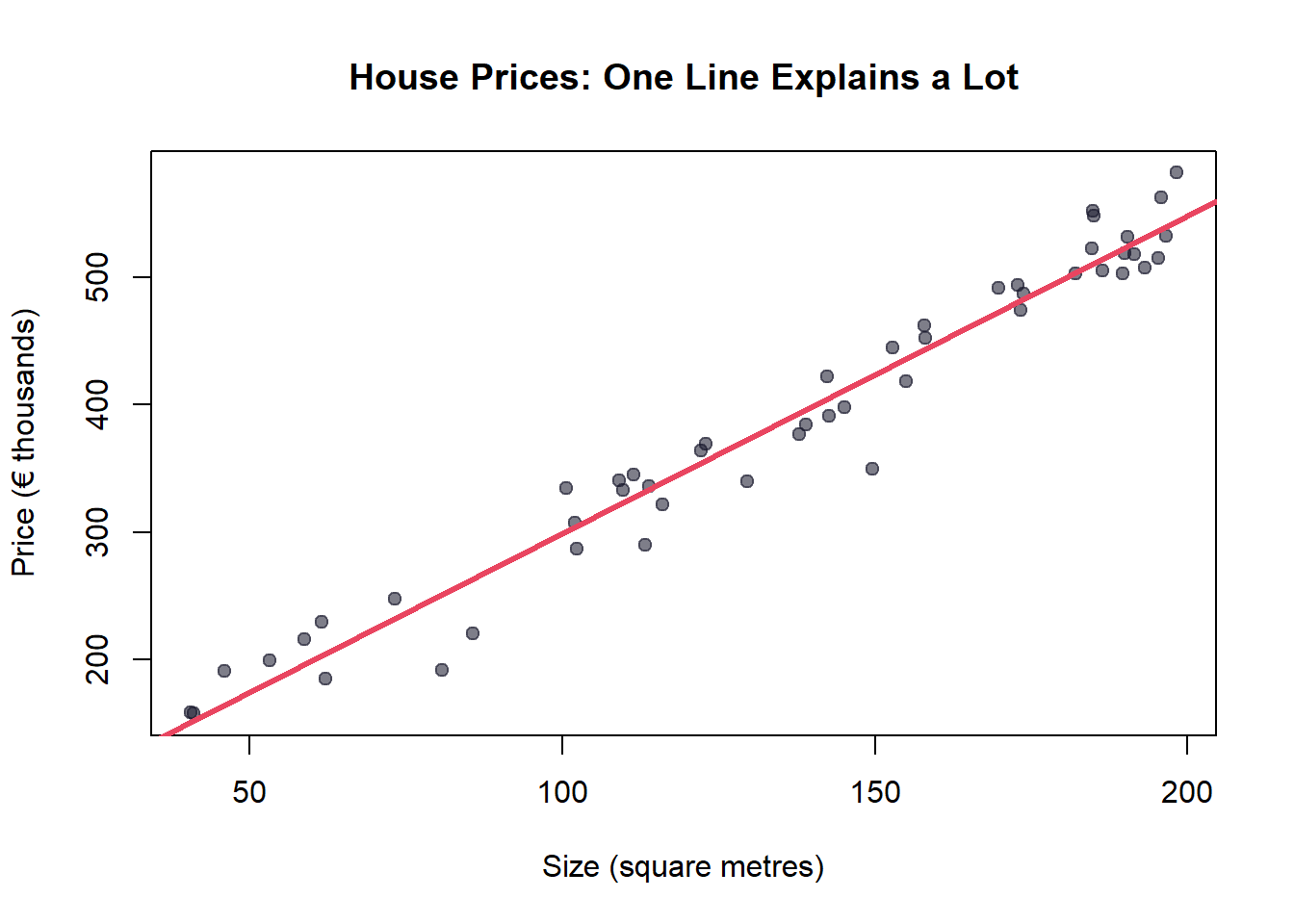 # Generate some example dataset.seed(42)n <-50square_metres <-runif(n, 40, 200)price <-50000+2500* square_metres +rnorm(n, 0, 25000)# Fit the simplest modelmodel <-lm(price ~ square_metres)# Plotplot(square_metres, price /1000,pch =19, col ="#1a1a2e90",xlab ="Size (square metres)",ylab ="Price (€ thousands)",main ="House Prices: One Line Explains a Lot",family ="sans", cex.main =1.2)abline(model$coefficients[1] /1000, model$coefficients[2] /1000,col ="#e94560", lwd =3)